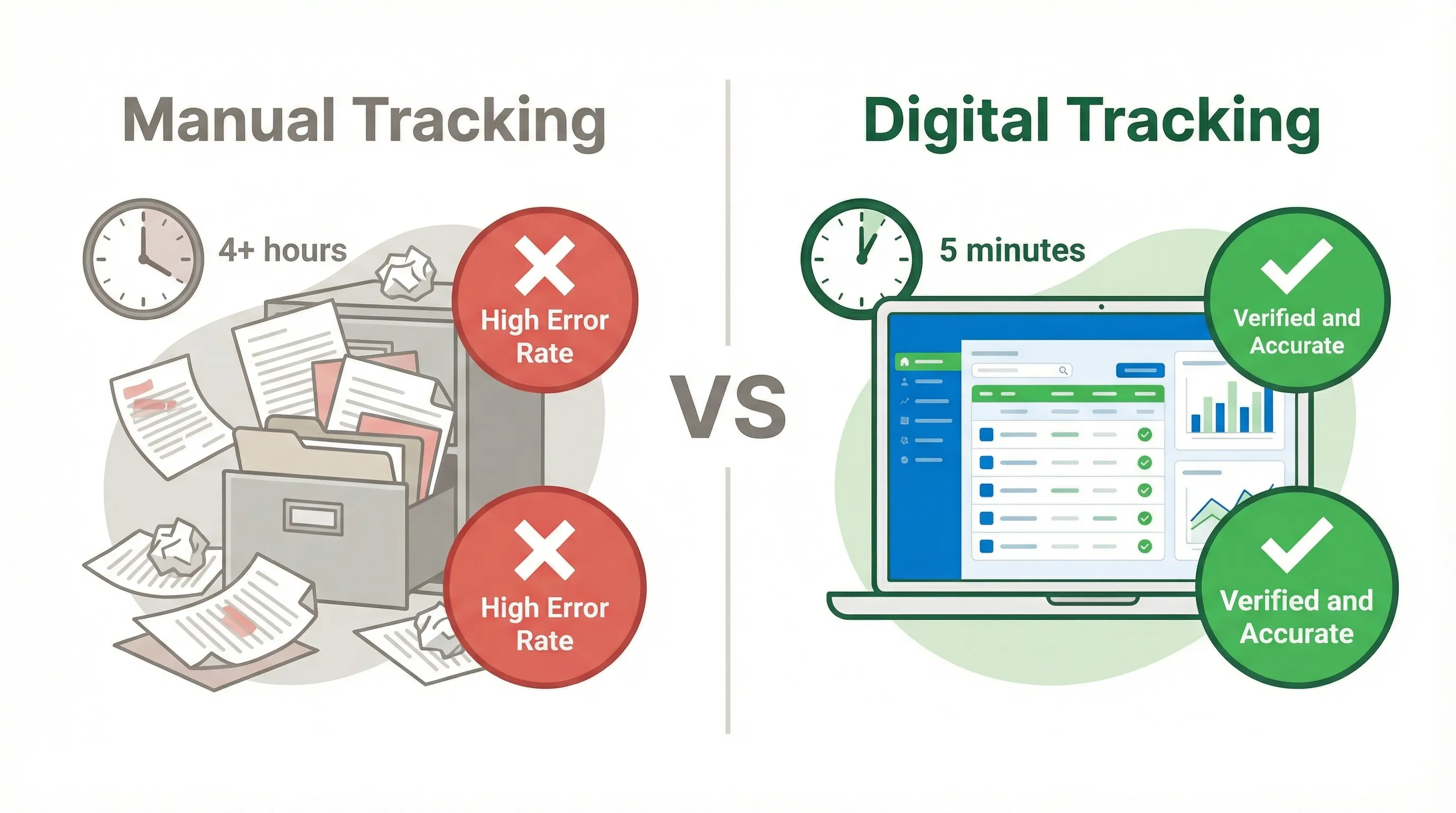 Digital tracking with automated documentation eliminates this problem. Records are searchable, organized, and compilable in minutes instead of days.